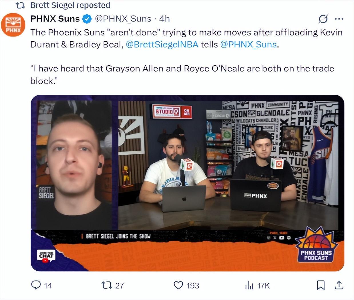 Brett Siegel透露太阳队后续还会继续运作,小奥尼尔、阿伦都已经摆上货架,他们正在多队询价,太阳想要能得到一些次轮签资产或年轻球员。