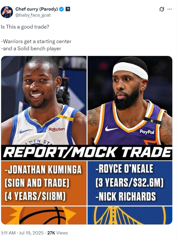 勇士媒体建议球队跟太阳做交易,库明加接受四年1.18亿的续约,先签后换去太阳换罗伊斯-奥尼尔、尼克-理查兹,这样勇士队至少可以补强一个年轻的五号位、一个侧翼的3D。