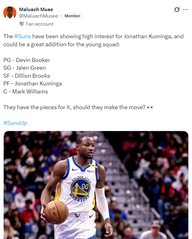 太阳媒体也觉得可以换来库明加,先发——布克、格林、狄龙、库明加、马威。